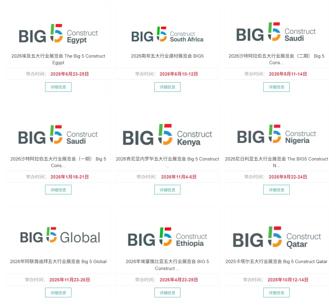 始办于1980年的中东迪拜五大行业展(BIG5)是中东地区最具影响力且是最大型的建筑、建材及服务类展览会。中东地区建筑市场的火暴和持续发展,带动了对建筑设备、材料、工程机械及车辆的强烈需求,更吸引了全球的关注。