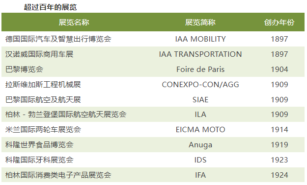 榜单中 10 个 “百年老店” 彰显行业根基,德国以 6 席占据主导,包括 1897 年创办的 IAA MOBILITY 车展、1919 年的 Anuga 食品展等。这些历经世纪考验的展会,至今仍是全球贸易的 “风向标”。
