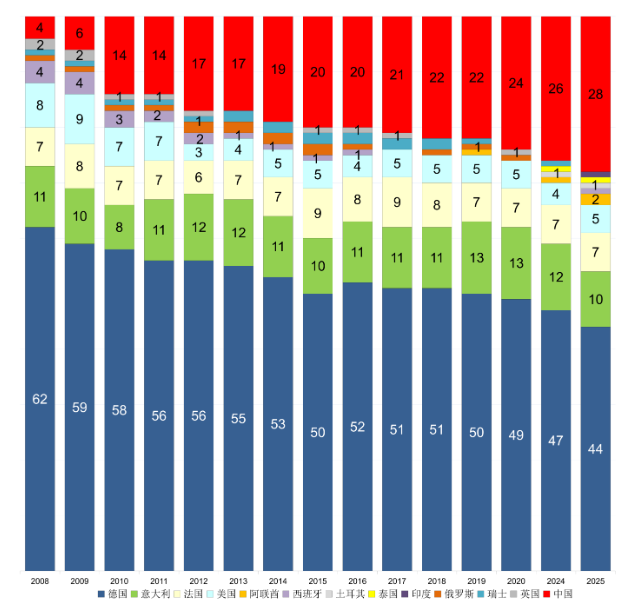 德国虽以 44 席保持领先,但较 2008 年的 62 席锐减 29%,优势持续收窄。中国则从 2008 年的 4 席飙升至 28 席,17 年间增长 7 倍,在全球场馆容量中占比 31.2%,远超德国的 7.3%。这种此消彼长的背后,是中国数字经济与制造业升级的双重驱动 —— 如 2025 慕尼黑车展上,116 家中国展商占据海外参展商总数的三分之一,比亚迪、小鹏等车企以全产业链生态出海模式,在传统德国主场上实现 “反客为主”。