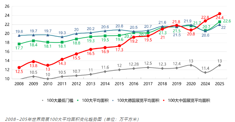 2024 年全球经济虽受多重冲击,但会展业凭借韧性实现逆势反弹。最新数据显示,2025 年商展 100 大平均面积达 22.6 万平方米,较 2024 年增长 1.9 万平方米,创历史新高。其中,前 10 大展览平均面积突破 40.5 万平方米,头部效应持续强化。